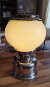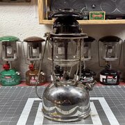 Stripped the rusty paint from the Kamplite fount then repainted it, guess the paint isn’t close wow what the vent color is. Had to rob a burner tube and cap from a AGM repaired fount as I failed to notice those parts were missing from the purchase. Luckily I had parts to get a generator to work. I like the mica chimney with lighting hole. Thought this wasn’t designed too well, then when I had it apart, the hard to reach screw for the air tube was accessible because the heat shield came loose from the collar, so reassembly was easy. Had to replace the generator tip, I think the original was too large as the lantern ran very yellow when originally lit. Works great now.