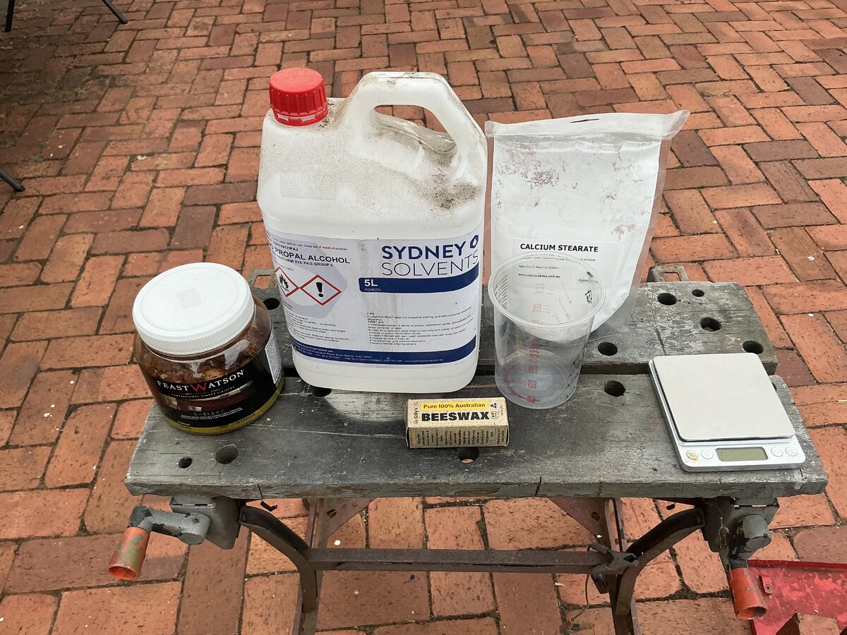 Quantities for the waterproof, UV stable Shellac, for anyone who wants to try it. 0.5 litres ISO Alcohol 125 grams Shellac flakes 15 grams beeswax 2 grams calcium stearate heat over electric element…not any kind of flame burner… dissolve shellac and beeswax. Add stearate and remove from heat…stir until cooled. this is tedious, but essential to achieve the emulsion state. Use lowest heat setting that will get the melt done. When cool, it should be an emulsion, yellow, gel consistency, with no discrete balls of wax. Store in sealed container. Apply with brush. ‘the finish can be heated with a heat gun to fix any unsightly applications. Apply inside and outside. Done. I will be making a batch as soon as my stearate arrives this compound is 100% biodegradable. There is another compound i will try, but that is not 100% biodegradable. I will update as things happen.