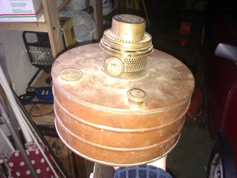 I like your lamps! I started out as a kid with wickies (feuer-hand and table lamps with kosmos burners) before leaving it all for several years. I was into stoves for a while and now I'm sliding into lamps again aswell! Everything that burns, eh? I thought this thread may be fitting to show off a yard-sale find of mine. I'm not sure if its a lamp or possibly a heater. Anyone have a clue? If it's a lamp it could be from a ships lantern, given the location of the yard-sale. Ii it's possible to make it work I'd be tempted to franken-fix it into a garden or patio light. Would it be possible to fit Aladdin parts on there? The regulating knob has the "Double dragons" mark of Erich & Graetz.