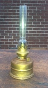 Here is my favourite wick lamp: a small Kosmos Brenner that is use to give light when I'm lighting my Tilleys in the dark. It is as found. It is 11" high with a 7" chimney with a steel fount.