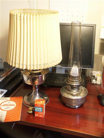 Nice lamp that you have there. I like those, too. A few years ago when I was in the US I bought a B&H Rayo in an antique mall. Not really a bargain, but I had to get it at home . It missed the generator/flame spreader, so I had to wait for a chance at ebay, and finally got...two! One was the correct, the other is now left over (the one on the right side in the third picture). It's a real kerosene guzzler (about 300mL/h).