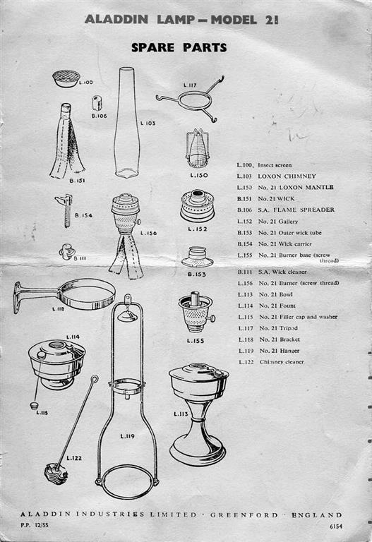 This is embarrassing. I don't collect these things, they just appear . . . honest! At the recent funeral of my wife's best friends Mother, we were invited to take whatever we would like from the house before the clearance team went in. Sat on a shelf in the sitting room was this Aladdin sans shade. The shade was thought to be upstairs somewhere, and it was duly found. Uugh! But it was original to the lamp which is a Model 21 made from 1953 on. My wife's friend said she remembered it from her childhood (b. circa 1953) and it had always been in the house. Whilst the mantle frame was present, the mantle material was not suggesting it had been used. Yet the wick is uncharred, and the font is spotlessly clean without any smell of old fuel. There was a wick trimmer, new spare wick, and instruction leaflet which shows many parts available on the back. We asked what they wanted for it and £5 was mentioned. We gave them £15. The other Aladdin we have was spotted by my wife during a trip to the Scottish Highlands, and a particular junk shop (ex-garage) in Kingussie - formerly the 'Star' garage. It's a Model 12 from 1928, and has a Bird-cage gallery (best way I can describe it) around the burner. No stand, and no chimney or mantle but £1.50 was the asking price. She came back feeling very proud of the purchase. I was less than enthusiastic. She thought I would like it. Ooops! But seeking data on the 'net came round to sorting it out and it performs well so I got let off in the end for initially being an ungrateful sod. Spares: