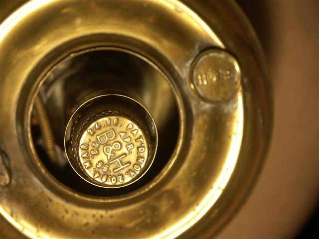 I'm afraid it's gotten worse . . . I was only browsing (really), and became a little interested in this beast - Well, I thought that looks a bit like an Aladdin, but the markings were B & H, and patents dating 1895 and 1902. It was definitely a central draught lamp, but not with an incandescent mantle. It had a wick stuffed in where someone thought a wick should be, but totally wrong size and misplaced. The chimney looked wrong and is, it's an Aladdin Loxon, though it fits. Back at the ranch further investigation takes place. American, (yes, all you Americans knew that didn't you!), and made by Bradley & Hubbard interesting history. Well made too. The wick winder winds a rack connected to a sprung stirrup within the font: The jaws grip the wick holding it against the central draught tube, here's one of the pair The chimney carrier is neat too, rather like the Aladdin where the chimney and mantle are bayonet fitted to the burner, the B & H has the carrier able to lift vertically - and turn a few degrees allowing it to rest steady while a match is applied to the then exposed wick lowered lifted That raised vein is the channel in which a spigot is run seen here lifted off It covers a spigot seen here when lifted off The correct chimney can be seen HERE - not identical, but very close.