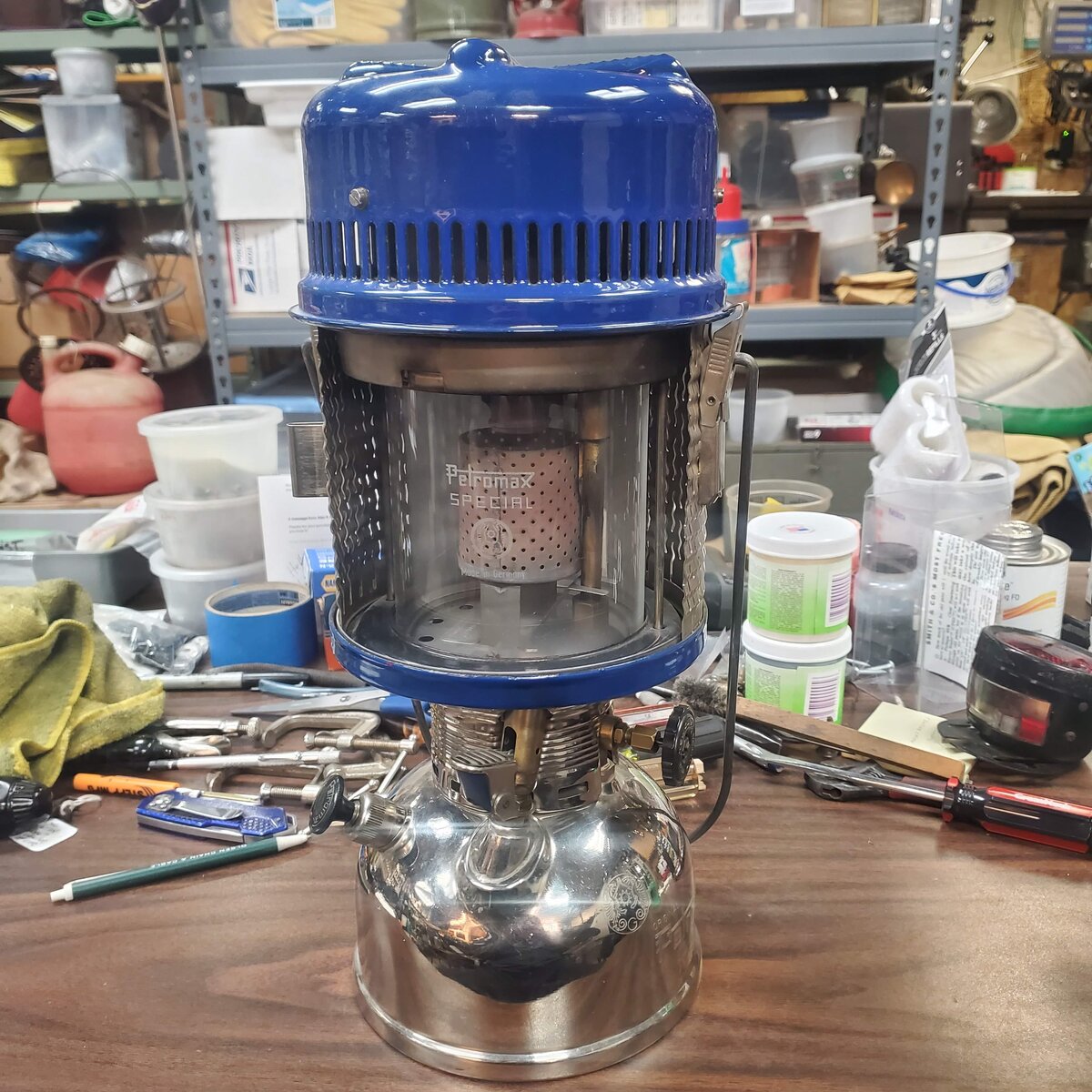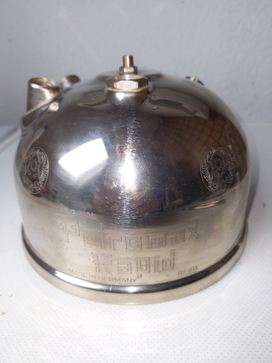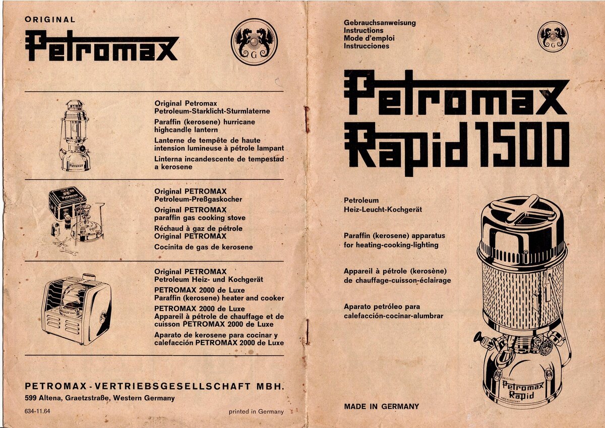 This is a Petromax 1500 from 1965 ( 0854 ) , used for heating , lighting and cooking . I had to buy the glass cylinder and the radiator separately .The additional cooking ring for larger pots is unfotunately missing . One hole in the support frame was to small.Therefore , one of the three Supports had been incorrectly positioned for 60 years ! I noticed it when I opened the metal door and installed the radiator .