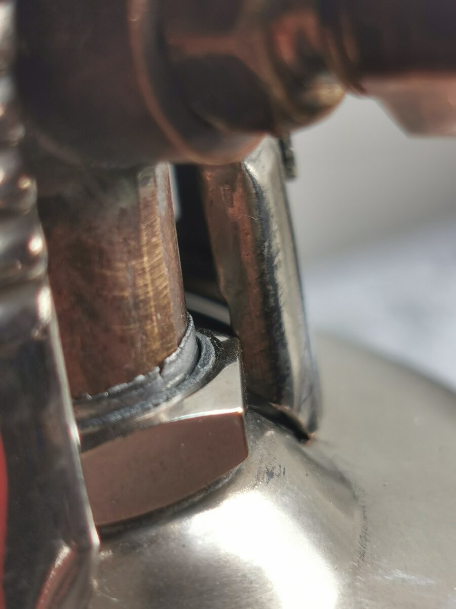 Yeah I pushed it up but it still wasn't enough sadly Noooo we get these gorgeous lamps for the 500cp POWER don't we? Haha. I've taken a couple more. Not sure what else I can show? Thanks Erik.. Well this last turn that I did was VERY stiff and squashed the lead washer a lot.. I am concerned that any more and it'll break if not already. After dismantling I removed the old lead washer. I replaced it with a new one from the Base camp site.. It didn't seem unusually thick. There is an air mixture screw/paddle, it's loose and lost it's weld or fixture in the J tube (another issue to deal with) so it's wonky. But I don't understand how being in the wrong position could effect the gap. You can see in one of the pics that the lead washer is squeezing out of the bottom where it screws into the fount. The other pic is the highest position that it'll go.