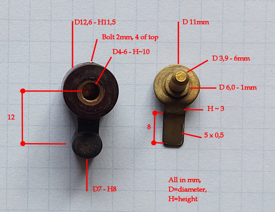 Some pictures as well as dimensions. Made of pertinax (?), all corners rounded. Latch height (3mm) is difficult because I don't want to bend mine before I have globes. Height of the part is without the rounded tops, so include 2mm extra I guess. Paper grid is 5mm ps the last picture (6) is not the right position, just a way to keep the metal part stand up.