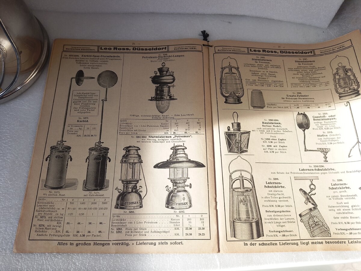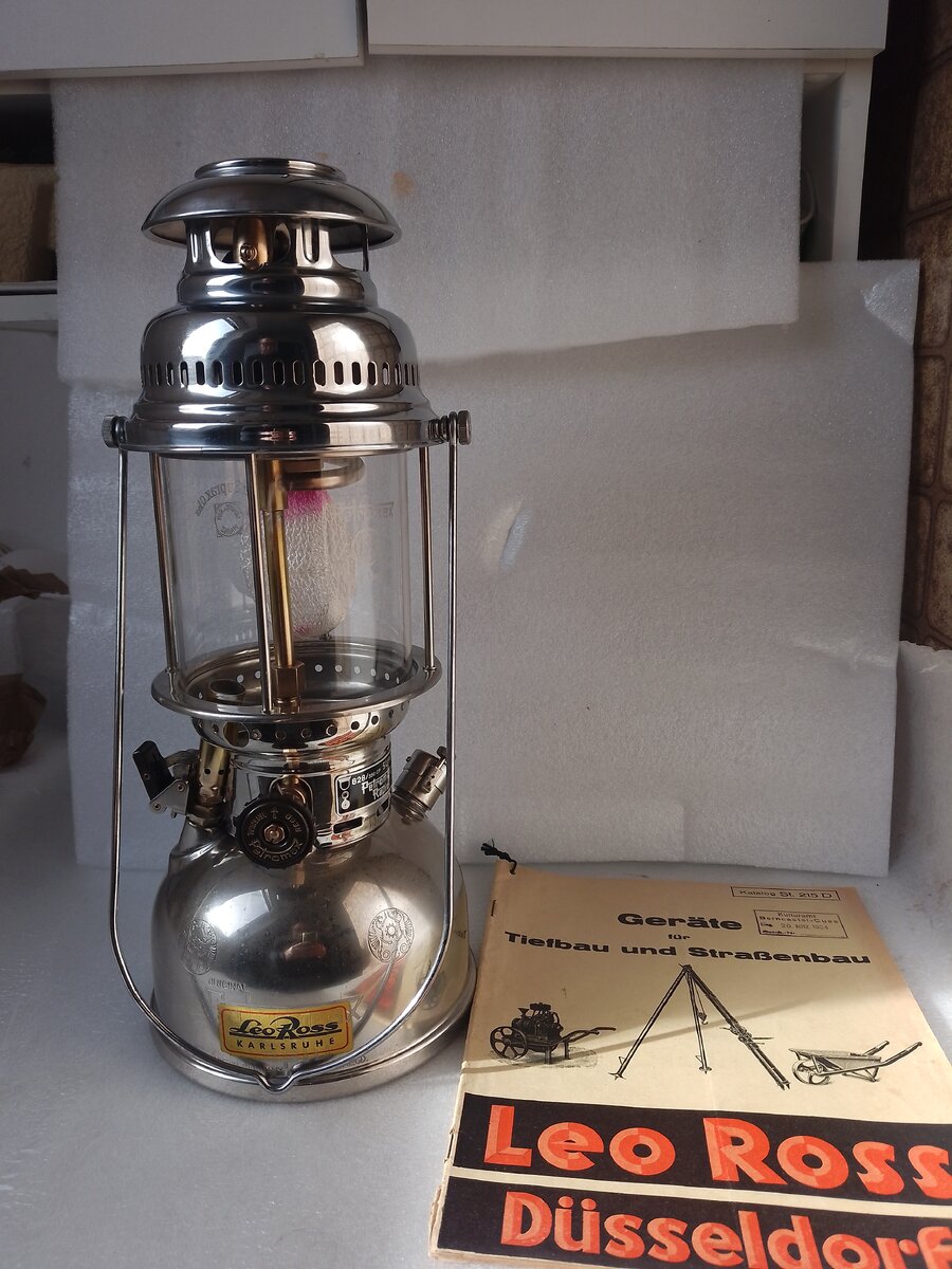 Petromax Rapid 828 with smooth carrying frame 350 cp The lantern was apparently hardly used,if at all. I had to desolder,repair,and resolder the leaking pump The tank scratches are faint but perfectly legible 10/6 A typical feature is the pressure gauge, which Petromax only offered in this design in the 1950s. Leo Ross was a dealer who sold equipment for civil engineering and road construction. The company existed throughout Germany before and after the Second World War. Petromax lamps were also offered in their catalogs .The catalog shown is from 1934 and my Petromax 828 is from 1956.