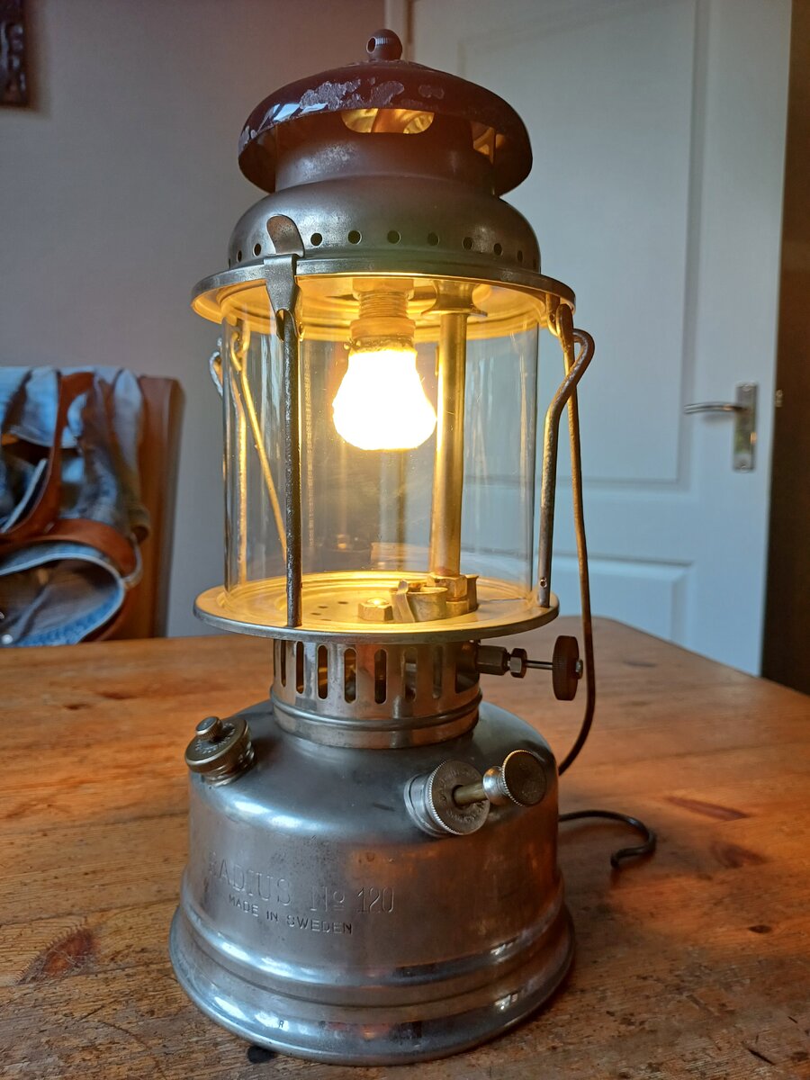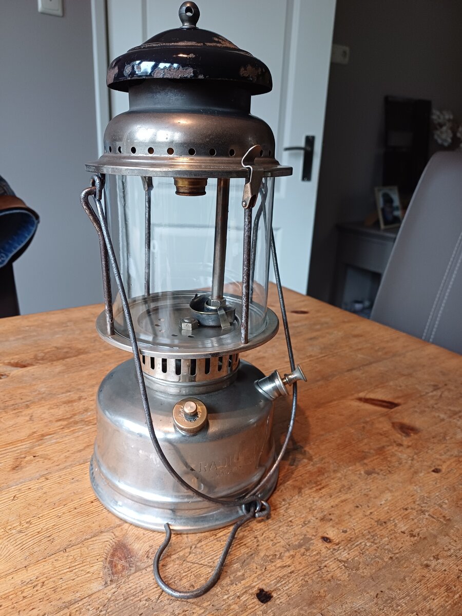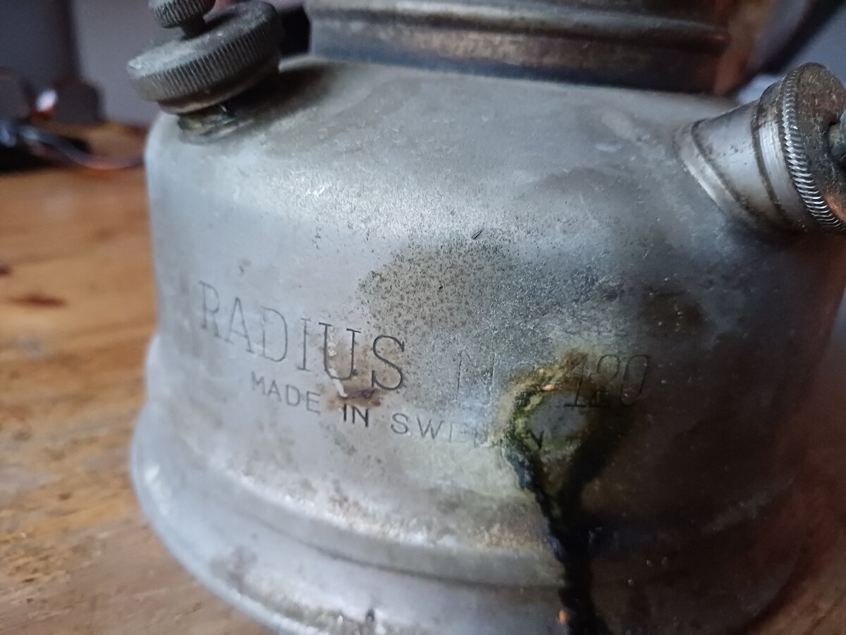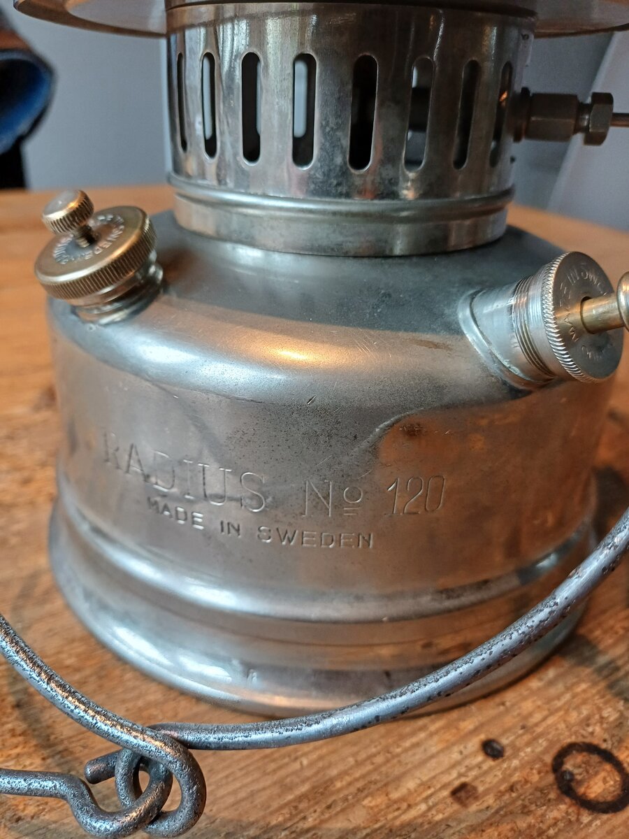 Here's my Radius 120. I found it a couple of weeks ago. The lantern was very dirty, lots of dust and old fuel remains. It cleaned up very nice. The only thing that was missing, is the knob for moving the needle up and down. I replaced with one that looks like the original. The globe is original, the brand name " Radius" is barely visible, but still there.