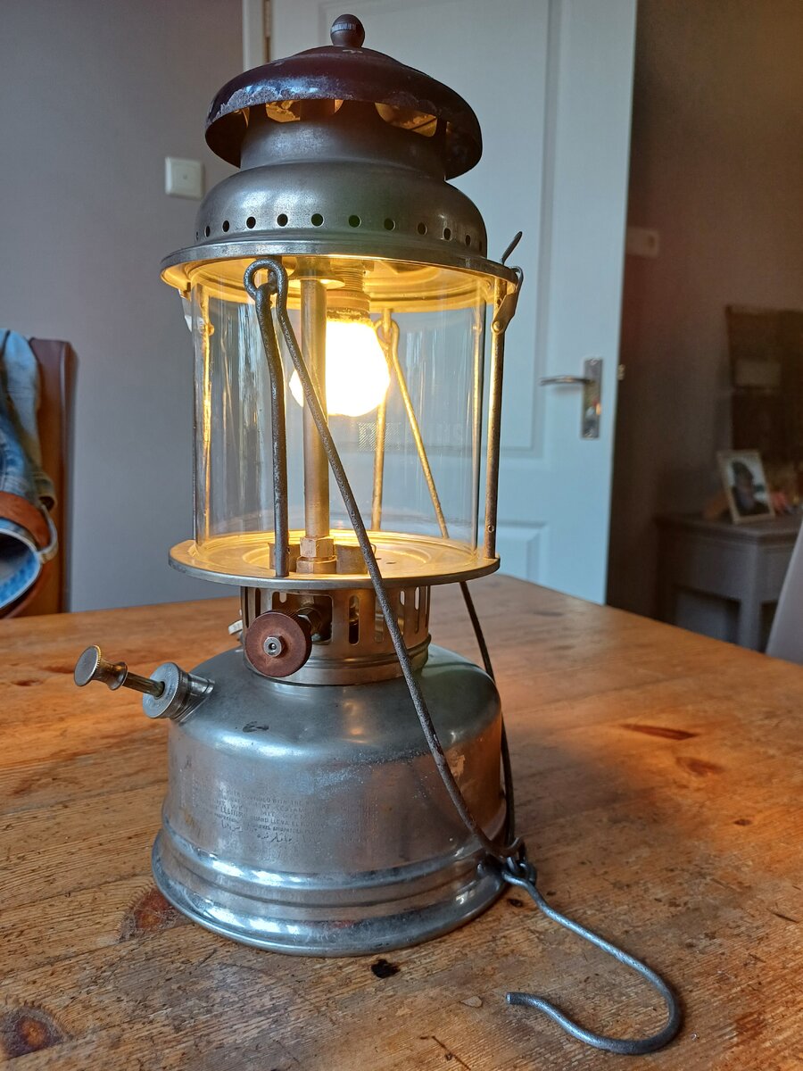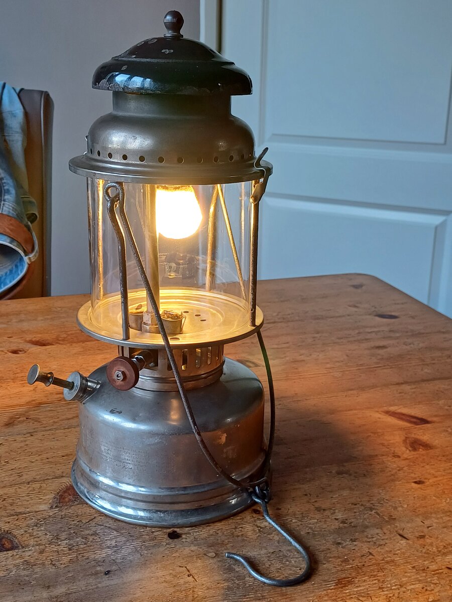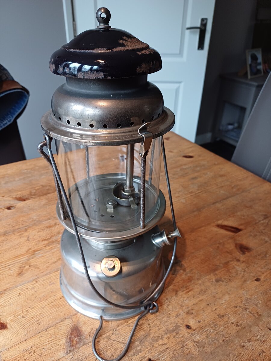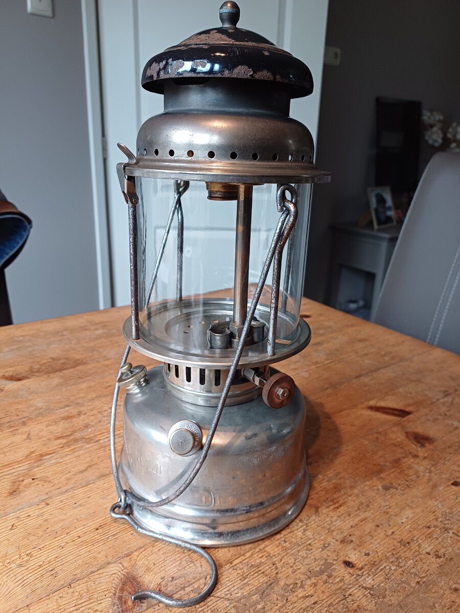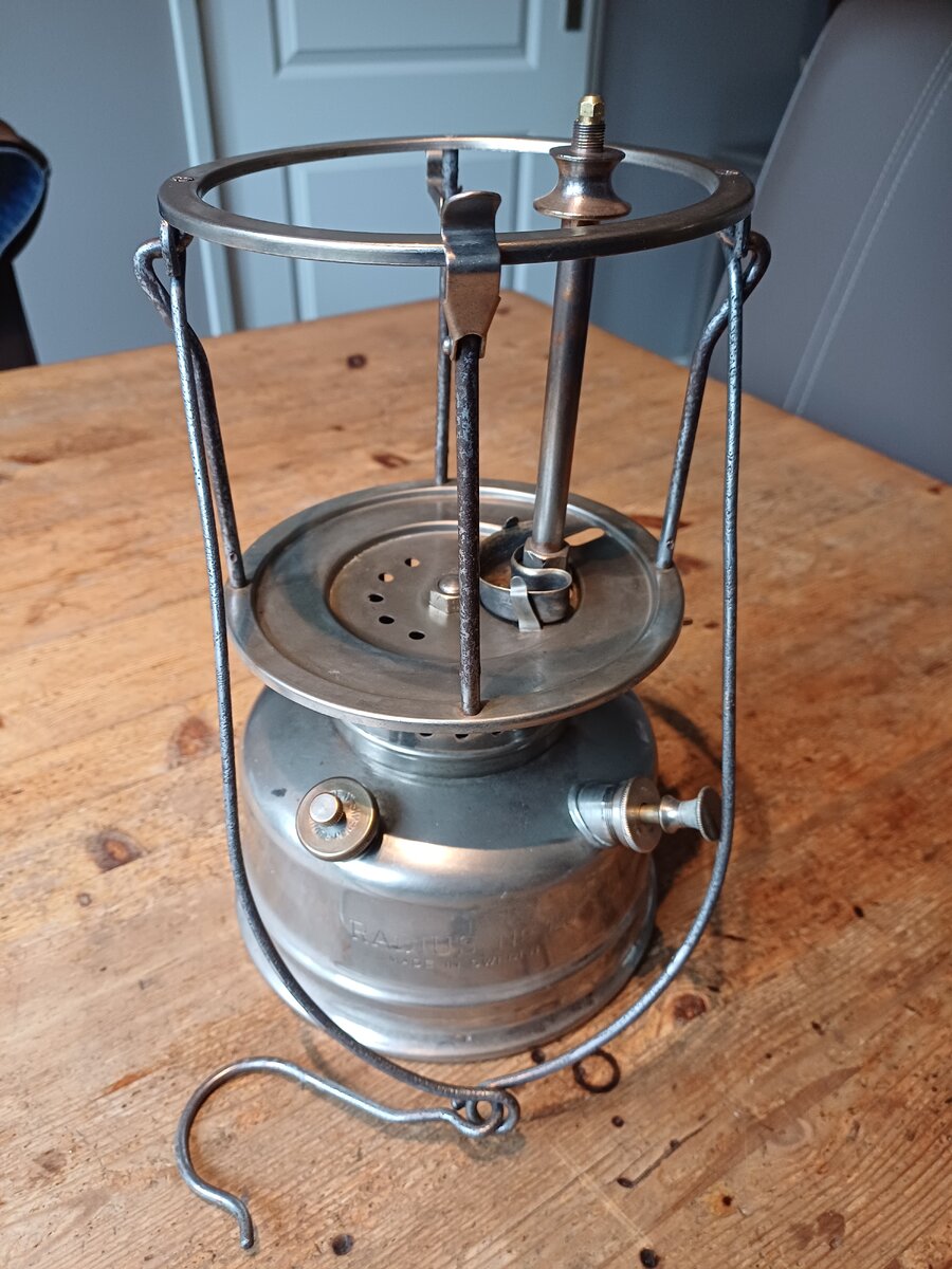 Here's my Radius 120. I found it a couple of weeks ago. The lantern was very dirty, lots of dust and old fuel remains. It cleaned up very nice. The only thing that was missing, is the knob for moving the needle up and down. I replaced with one that looks like the original. The globe is original, the brand name " Radius" is barely visible, but still there.