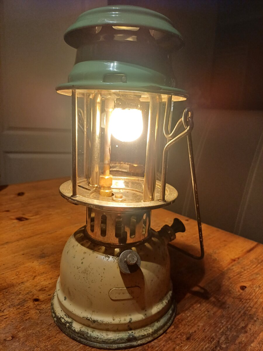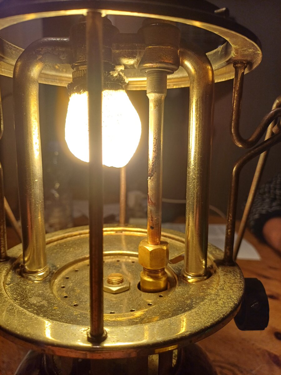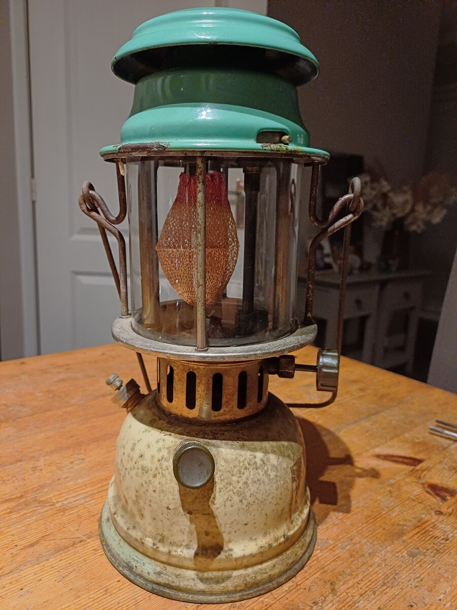 Here's my latest find, a Thermidor. With the original globe. The spirit cub is missing, and I had to start the lamp with an Tilley pre- heater. The first mantle was to small (300-400cp), so after a few minutes, the light started to flicker and flames came out the vapouriser. Then I put a bigger mantle in the lamp (500cp), this one is closer to the vapouriser, and the problem was solved.