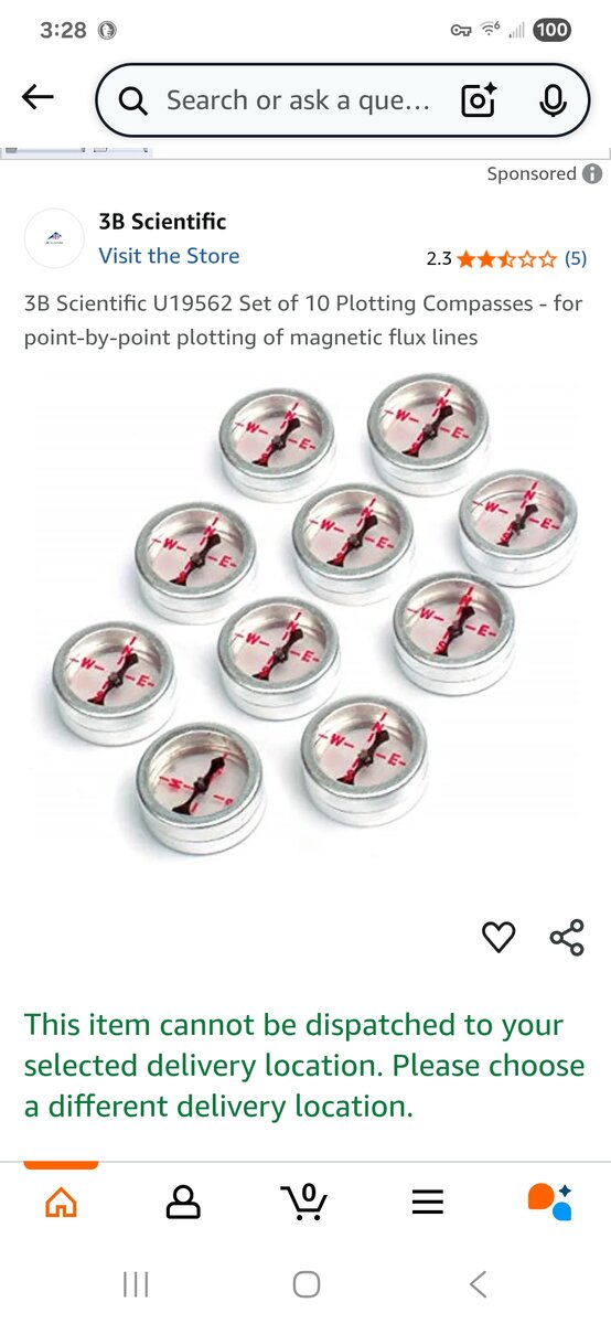Thirty seconds later:- 3B Scientific U19562 Set of 10 Plotting Compasses - for point-by-point plotting of magnetic flux lines : Amazon.co.uk: Stationery & Office Supplies