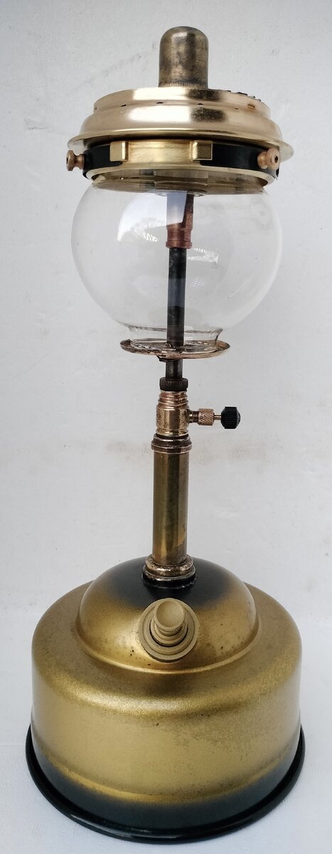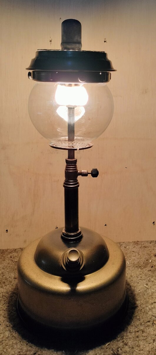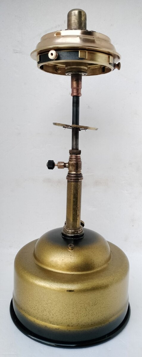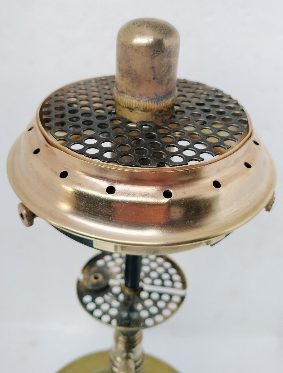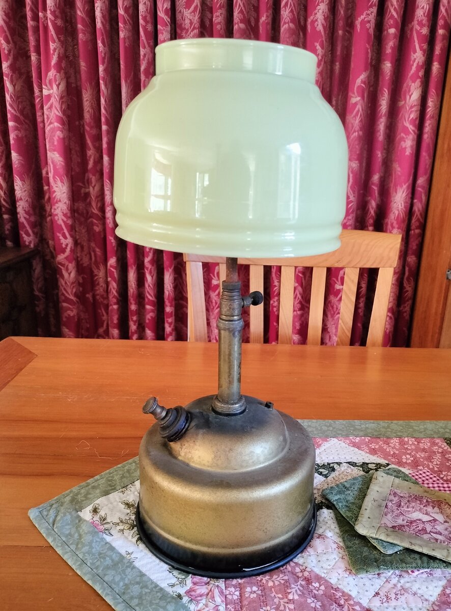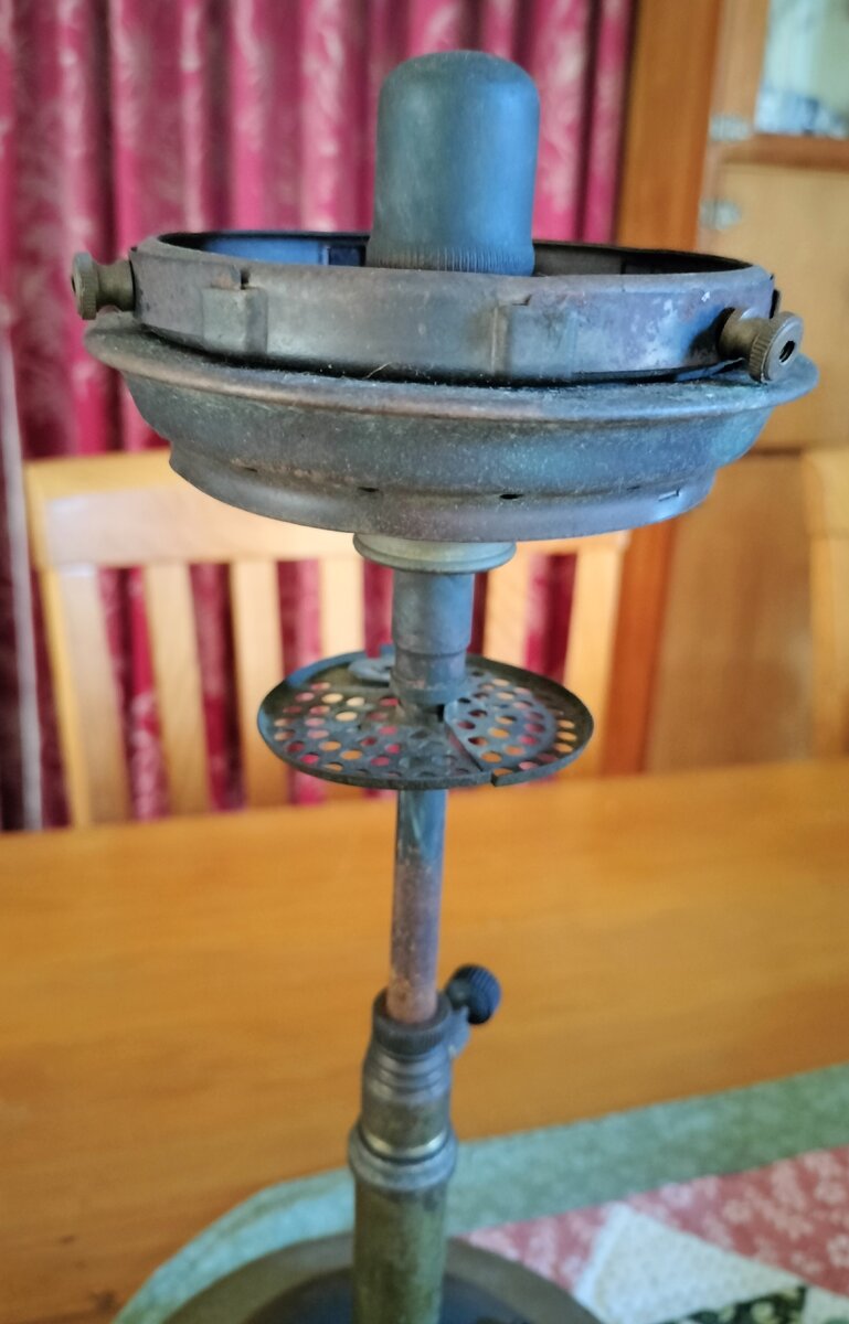 I found this lamp locally on Marketplace. The woman said it had been her mothers and had been in the home as long as she could remember. This lamp came with top and a bottom insect screen, which makes me believe it was originally fitted with a 182 globe as well as the “champagne” shade. It is designated TL 136/IP because it has the shade (making it TL136) plus a No. 182 globe and top and bottom insect screens (IP = Insect Protection). The burner dome is stamped PAT. No. 202485 The Vapouriser is stamped PAT. 524719-375977 As found