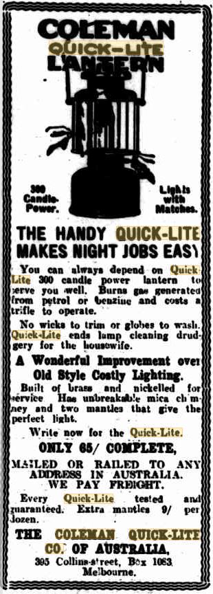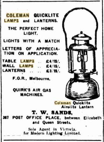 Coleman lanterns were for sale in Australia. Local Agent for Coleman Lamp Co of America.
