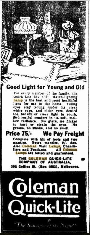 9 14 April 1923 Melbourne, Vic Coleman Table lamp Advert
